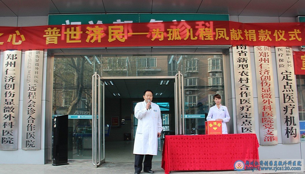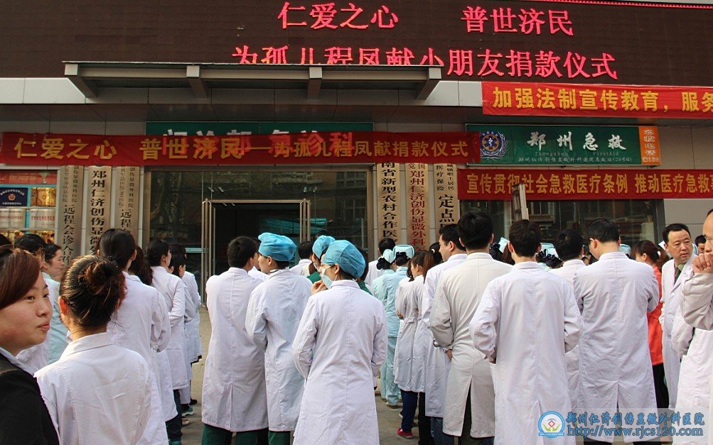 针对此情况,医院院委会倡导将仁济医院“仁爱之心 普世济民”之精神落实在具体行动上,3月27日早上8:30在郑州仁济医院大门口举行“仁爱之心 普世济民——为孤儿程凤献捐款”的活动,全院200余名职工参加了此次捐款,截至发稿,共计捐款11071.5元。另外,院办印发小凤献情况的宣传单页向路人发放,为小凤献的治疗,募集更多的捐款。